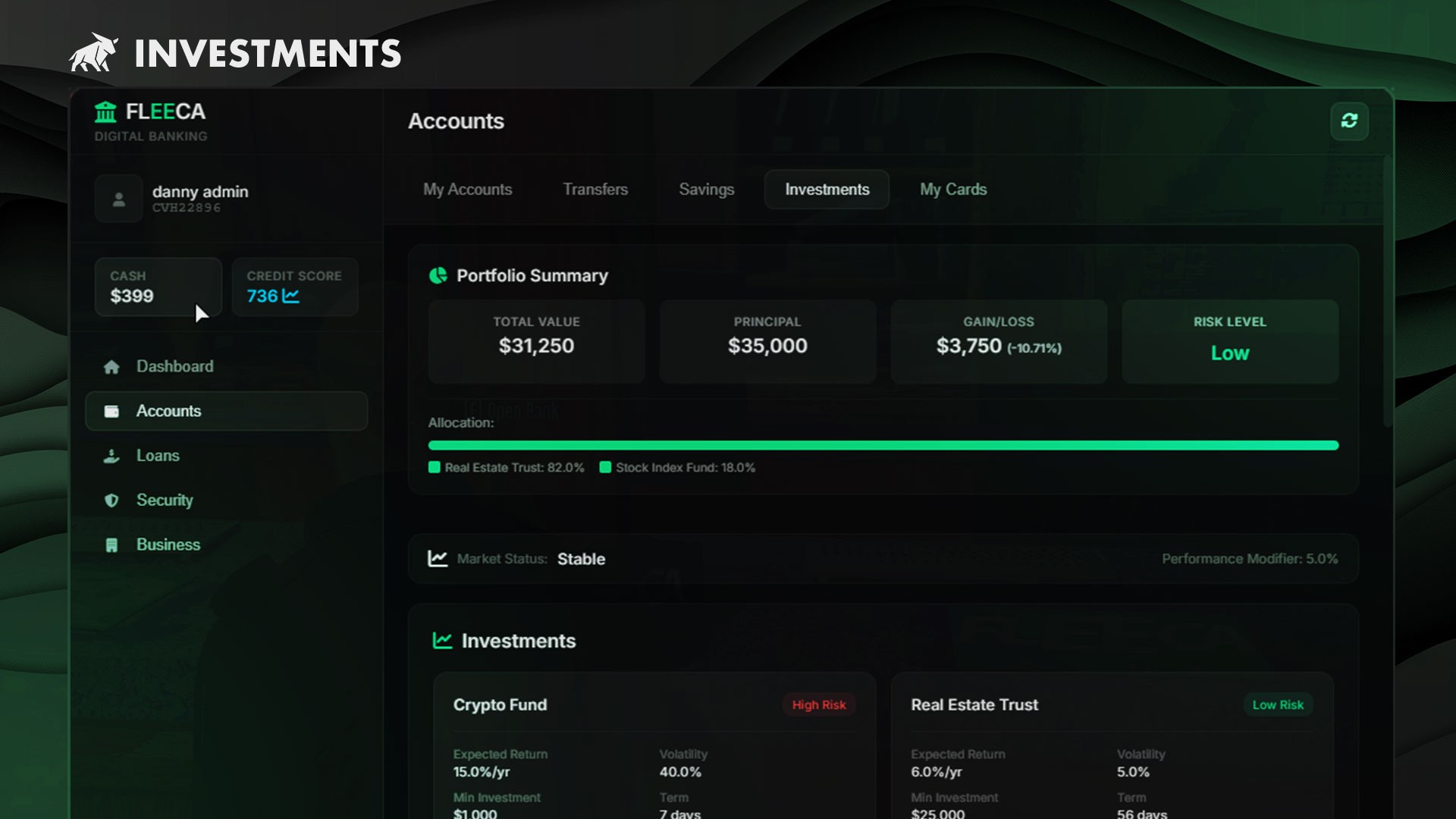 - Investment Products — Savings Bonds, Stock Index Fund, Crypto Fund, Real Estate Trust
