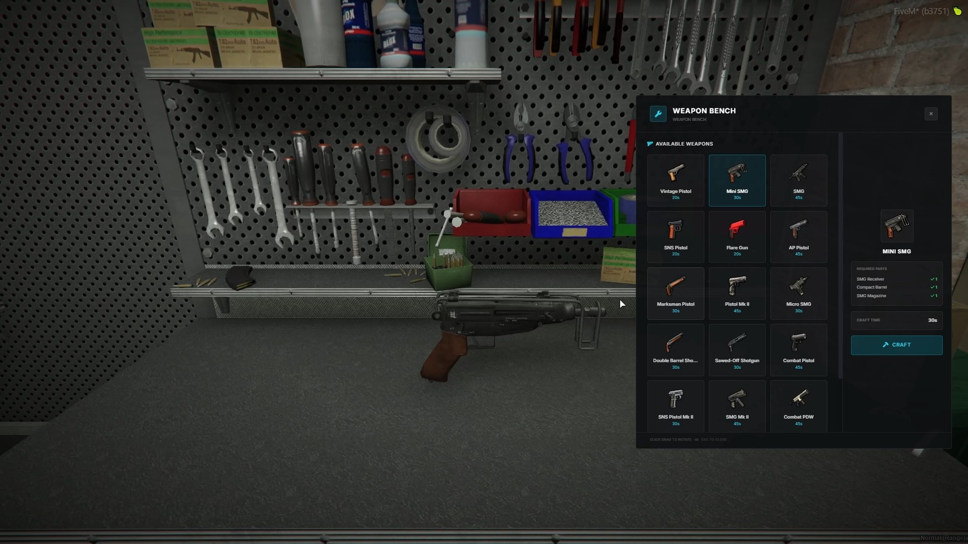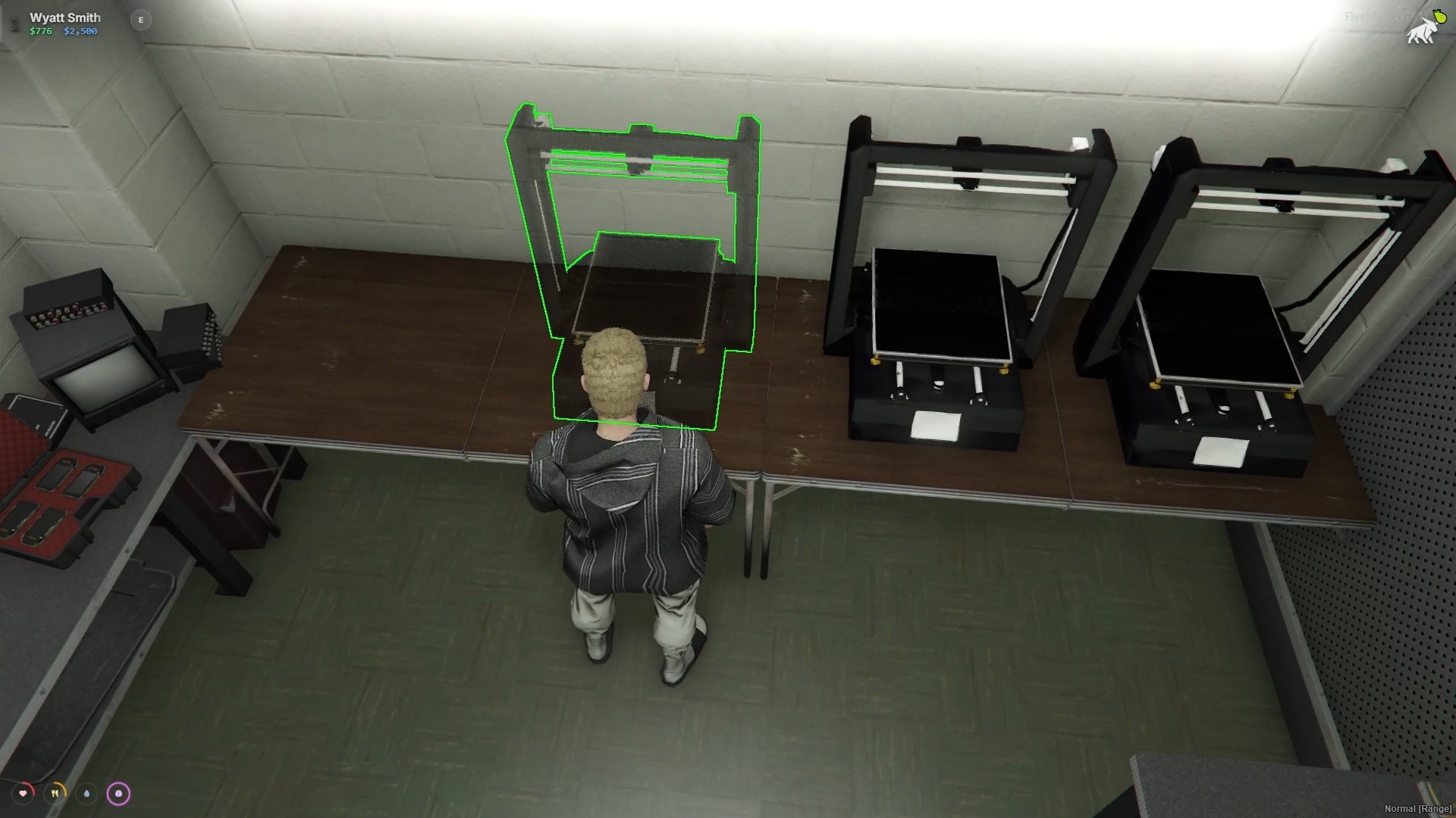 - Placeable Equipment — Printers, workbenches, and decorative tables are placed from inventory items with ghost-prop positioning. Per-player limits and configurable safe zones prevent abuse. All equipment persists to database with coordinates, rotation, and routing bucket.