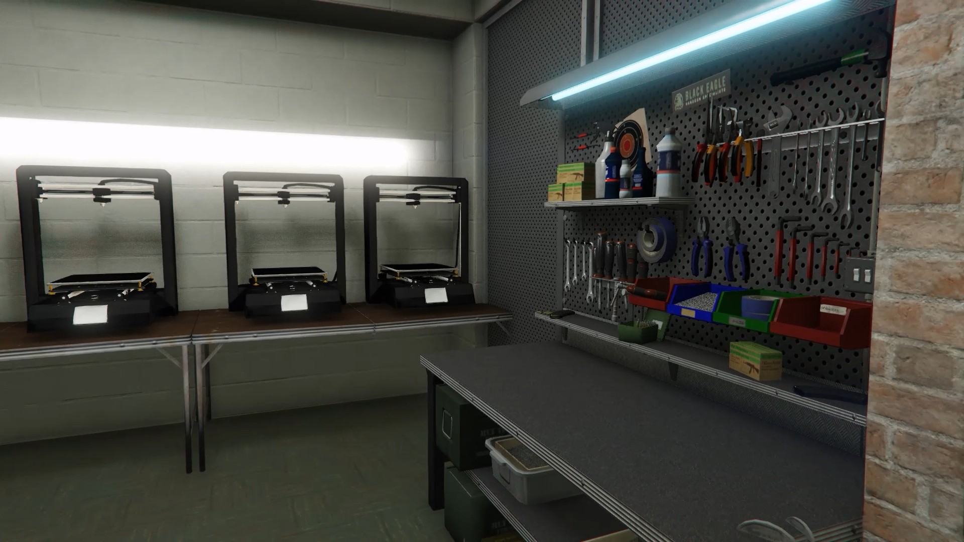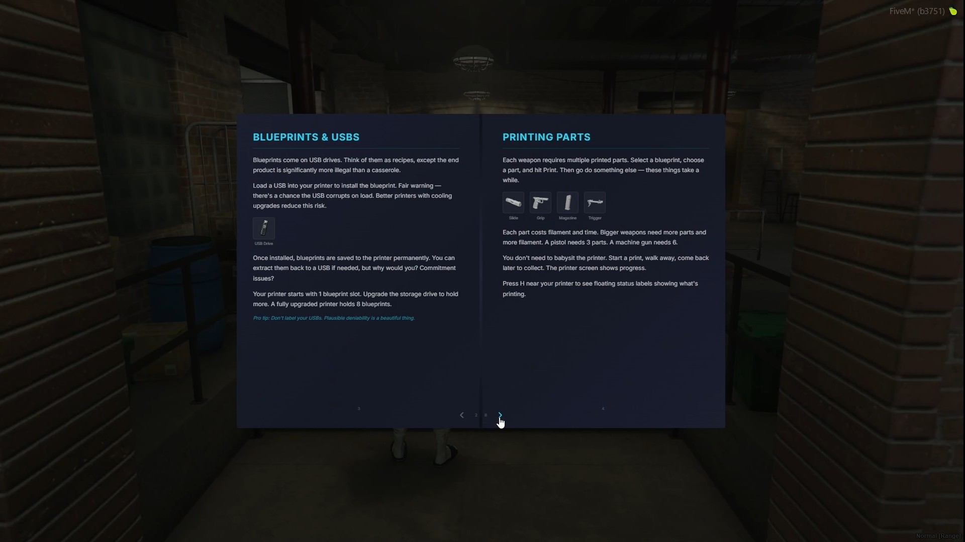 - 3D Printing — Place printers in the world, load blueprint USBs, select parts, and print with real-time countdowns. Each printer persists across restarts and tracks its own upgrades and stored blueprints. A live DUI screen displays status, active print, and countdown timer directly on the prop.