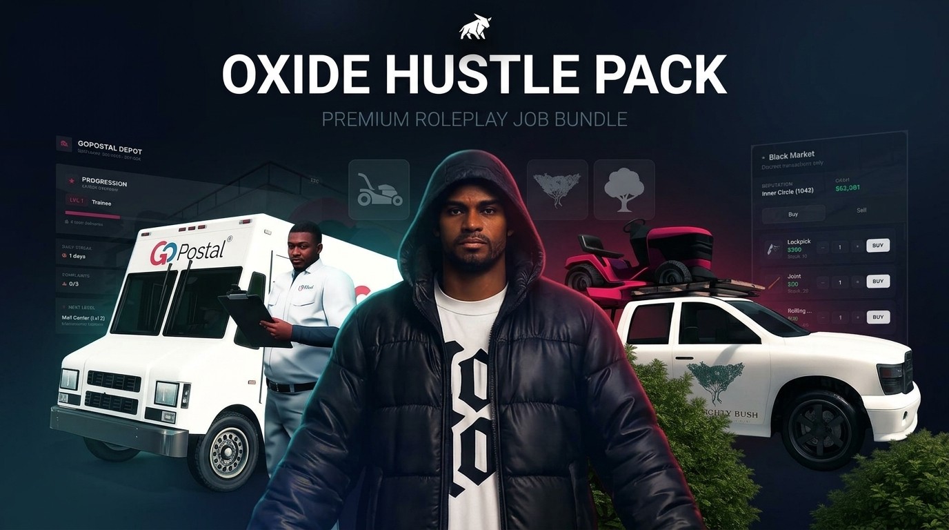 - Oxide Blackmarket ($9.99) — A roaming underground dealer with a 5-tier reputation system, police dispatch mechanics, hit squad retaliation, loot drops, and a burner pager for locating the dealer. The backbone of your server's criminal economy.